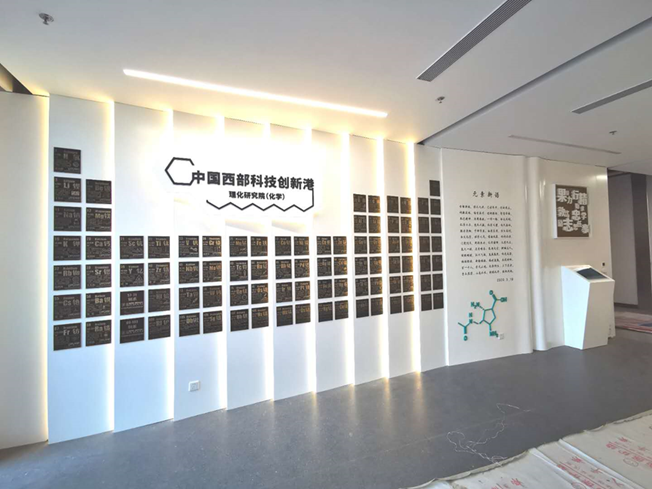 在文化元素的具象化方面,学院着力突出化学学科的特有化学元素和特征,并在此基础上凝练出文化意象,同时融合平面设计、交互式新媒体等表达手段,坚持艺术性与实用性的有机统一,从而实现综合式教学科研空间全方位、立体化和实时性呈现。其中,在化学研究院一层正东走廊,设计“学科分析测试平台”走廊区域,悬挂介绍展板并设置液晶显示屏,介绍各台(套)仪器的功能、使用规范,显示设备3D影像、设备预约情况。在二层正东走廊两侧悬挂研究概况展板,介绍各科研平台及研究所的研究方向、研究成果和相关成员信息。在二到五层正东走廊中部放置交互式电子屏,滚动播出各研究所相关方向科研进展和成果等科研动态。在四层还设计建设了校企合作展示区,基于学院办学理念、育人模式、产教融合、成果转化、脱裤吧等方面对校企合作进行综合展示。同时,在五层也建设了多功能教工之家,布置风格温馨的教工风采展示区作为党务、会议、培训等工作的开展场所。在各楼层的公共区域放置了沙发、跑步机、乒乓球台等休闲、锻炼设施,供师生工作间隙放松身心,营造轻松愉快、团结合作的工作氛围。