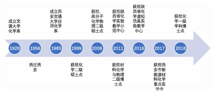 始于1928年的交通大学化学系。1956年,化学系随主体西迁至西安。在西部为国家建设和社会发展培养了众多优秀青年才俊。2020年,化学学科独立建院,在两个大变局的新时代背景下迎来新的时代机遇,在教育科研跨越式发展的新征程上迈出了坚定的步伐。