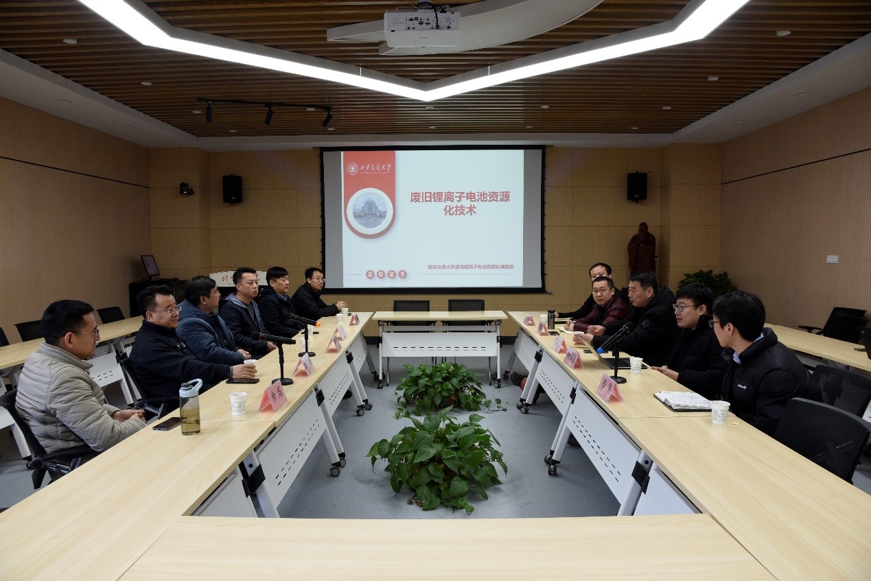 院长丁书江、副教授杨国锐等与董志彬一行就废旧锂离子电池资源化等项目进行合作洽谈。
