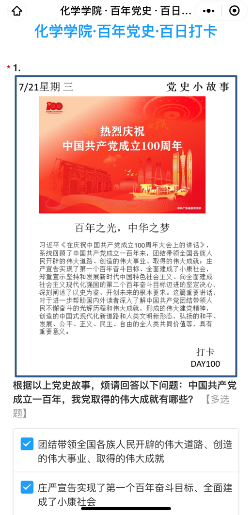 ·百年党史·百日学习”活动,利用微信小程序,每天发布党史图片和相关的党史知识,设计1-3道党史知识题,促使学院全体党员了解学习我党发展过程,各支部党员平均完成率达到95.6%。4月初,为学院全体党员制定特色化、差异化、追求实效的“三审四学”学习计划。即党员—支部书记审定,支部书记—党委审定,领导干部—党委书记审定。每名党员均制定包括“必须学”“重点学”“补充学”“拆分学”的学习计划。发放学习教育辅导用书,督导基层支部制定特色学习教育计划并组织党员进行集中和个人自学。6月底,学院开展了“我以西迁赋,敬党百年兴”活动,通过以“我是交大化学人,西迁精神有我传”为宣言,组织全体师生党员以团队、个人、支部等形式在学校各标志性建筑物前打卡朗诵西迁赋。传承西迁精神,做到学史明理、学史增信、学史崇德、学史力行,学党史、悟思想、办实事、开新局。7月初,学院面向全体师生党员、师生党支部开展“学党史、践承诺、见行动”主题活动并在学院设立各类集体和个人奖项。深挖学院师生中的先进典型,发挥示范引领作用。利用爱国主义教育基地等载体,多形式多批次组织开展爱国主义教育活动。5月10日,S0112团支部开展“学党史、强信念、跟党走”主题团日活动;5月15日,研究生干部赴照金开展“学党史、悟思想、办实事、开新局”主题学习实践活动;9月底,新生支部分别参观了交大西迁博物馆和脱裤吧