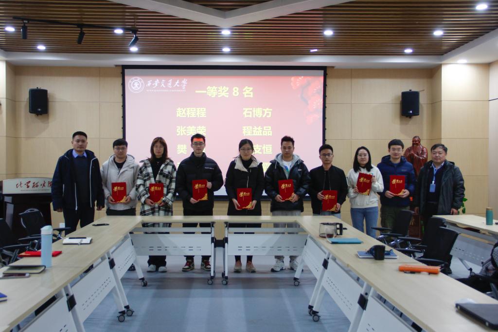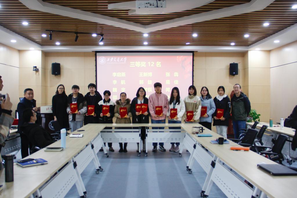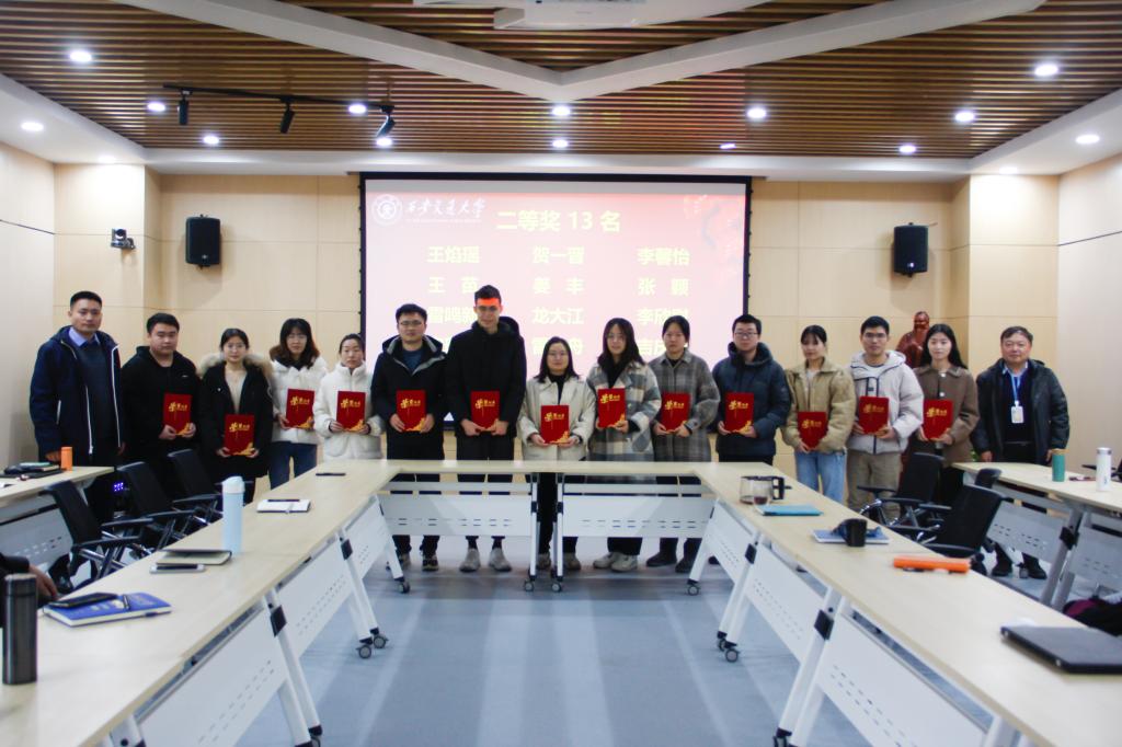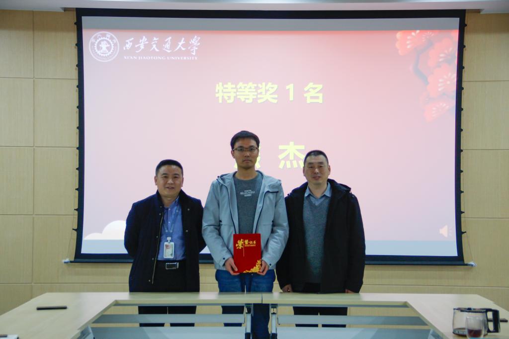 张志成书记和丁书江院长为获得特等奖的熊杰同学颁奖,熊杰同学发表获奖感言,对辛勤培育的导师表示崇高的敬意。他表示,今后要以更高的标准严格要求自己,将感恩作为对自己的激励和鞭策,以认真严谨的求学态度继续努力学习,坚持钻研和探索,取得更加优异的成绩,回报社会,成为为国家的建设和发展有用的人才,也鼓励课题组的同学们都能继续努力,共同进步。赵程程等8名同学获得一等奖,王熖瑶等13名同学获得二等奖,李启蒸等12名同学获得三等奖,学院领导及课题组老师为获奖学生颁奖并表示祝贺。
