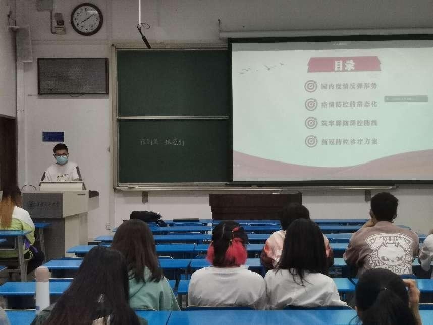 随后,徐斌展开了以“抗击新冠疫情”为主题的汇报演讲。徐斌主要从国内疫情反弹形势、疫情防控的常态化、筑牢群防群控防线和新冠防控诊疗方案四个方面展开讲述。他介绍了奥密克戎病株的特征和现在疫情防控常态化的特点,并指出当前国内疫情形势严峻,需筑牢群防群控防线。徐斌就群防群控指出了“外防输入、内防反弹”、“科学精准、动态清零”、“生活平稳、生产有序”和“党政同责、齐抓共管”四个关键词,并在新冠防控方面讲述了正确的防控措施。
