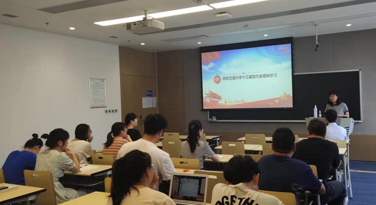 十三届党代会精神。梁老师介绍了大会主题是高举习近平新时代中国特色社会主义思想伟大旗帜,深入学习贯彻党的十九大和十九届历次全会精神,全面贯彻习近平总书记来校考察重要讲话精神,牢记为党育人、为国育才使命,落实立德树人根本任务,胸怀“国之大者”, 弘扬西迁精神,勇担国家使命,共创交大荣誉,加快建设中国特色世界一流大学,以实际行动坚决拥护“两个确立”、坚决做到 “两个维护”,为全面建设社会主义现代化国家做出更大贡献。梁老师还介绍了我校第十二次党代会以来的主要工作及取得成绩,宣传了我校未来五年的任务目标以及方案措施。分享结束之际,梁老师呼吁大家站在新的发展起点上,要更加紧密地团结在以习近平同志为核心的党中央周围,弘扬西迁精神,勇担国家使命,共创交大荣誉,为实现第二个百年奋斗目标、实现中华民族伟大复兴的中国梦做出新的卓越贡献。
