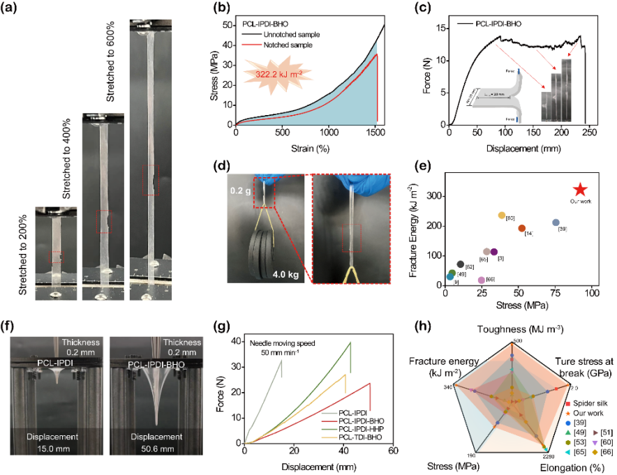 张彦峰教授团队采用无溶剂聚合的方法,通过聚己内酯二醇(PCL)、二异氰酸酯(IPDI)和N,N-双 (2-羟乙基)草酰胺(BHO)反应制备出了具有极高机械强度和韧性的可生物降解聚氨酯弹性体。这种弹性体结构中丰富的氢键相互作用阻碍了PCL段的结晶,促进了在弹性体内部形成均匀分布的硬相微域。通过对弹性体内部氢键相互作用和分布的进一步优化,奇迹般地实现了极高的强度(92.2 MPa的断裂强度、1.9 GPa的断裂真应力)和韧性(480.2 MJ·m-3)以及前所未有的高断裂能(322.2 kJ· m-2),加之良好的生物相容性和降解性,可通过3D打印技术制成疝气补片应用于生物医学。此外,就机械性能而言,该弹性体在柔性电子、缓冲吸能等方面同样具有很大的应用潜力。