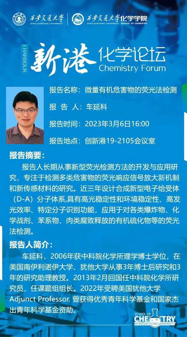 邀请,中国科学院化学研究所车延科研究员进行了题为“微量有机危害物的荧光法检测”的报告。本次报告由院长丁书江主持,张志成书记、张彦峰副院长以及学院相关研究方向教师和学生参与学术交流。
