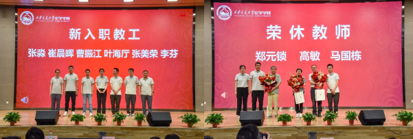 院庆仪式在“新教工入职、老教师荣休、优秀学子表彰”中达到高潮。严红昌副书记、段新华副院长代表学院对新入职的教职工表示欢迎并颁发院徽。“青年优秀人才计划”入选者曹振江代表新教职工发言,表示将以饱满的热情投入化学学科的建设,为学院发展贡献力量。新教工代表学院对即将荣休郑元锁、高敏、马国栋三位老师献上鲜花,对他们在职业生涯中对学院的辛勤付出表示诚挚的感谢。三位老师分别回顾了自己的职业生涯,同时勉励在场的青年师生不负韶华,努力奋斗,争取为祖国健康工作五十年。