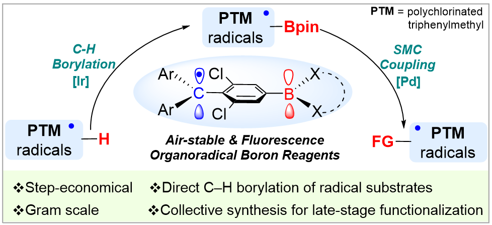 有机自由基因为具有未成对电子,呈现出独特的光电磁学性质,可应用于氧化还原电解质、发光分子、能量储存和传递等领域。同时,因为单电子占据的前线轨道(SOMO)极易发生氧化或者还原反应,所以大多数的有机自由基在室温空气中的稳定性较低。因此,与常见闭壳层有机分子相比,有机自由基的合成与直接衍生化面临着巨大的挑战。近日,饶彬课题组通过铱催化的C–H硼化反应制备了空气稳定的有机自由基硼试剂,成功应用于Suzuki-Miyaura偶联反应,合成了多种新型的三芳基甲基自由基分子。该团队的研究不仅极大地拓展了三芳基甲基自由基衍生物,而且为其应用和功能化衍生奠定了坚实的基础,同时也为开壳功能分子的合成提供了新思路。相关研究成果以《空气稳定有机自由基硼试剂》(Air-Stable Organoradical Boron Reagents)为题发表在德国《应用化学》(Angewandte Chemie International Edition)上(Angew. Chem. Int. Edit. 2023, 62, e202302835)。