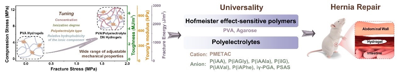 水凝胶已经是被广泛研究的柔性材料之一,但水凝胶中含水量高,往往力学性能较弱,难以满足承重组织替代品的需求。为了增加水凝胶的力学性能,研究人员提出了许多不同的策略,例如双交联网络、高缠结网络以及纳米纤维结构复合等等。成一龙团队首次发现利用聚电解质可以通过Hoffmeister效应明显地提高水凝胶的力学性能,所得到的DN水凝胶(PVA/P(iAA)水凝胶)的力学性能可以在很大范围内进行调整,抗拉强度可以从从21 kPa到1.45 MPa,伸长率从420到750%,杨氏模量从19到1020 kPa,韧性从0.04到5.43 MJ/m3,抗压强度从0.15到12.35 MPa。研究成果以《聚电解质增韧双网络水凝胶》(Toughening Double Network Hydrogels by Polyelectrolytes)为题发表在期刊《先进材料》(Advanced Materials)上(Adv. Mater. 2023, 2301551)。