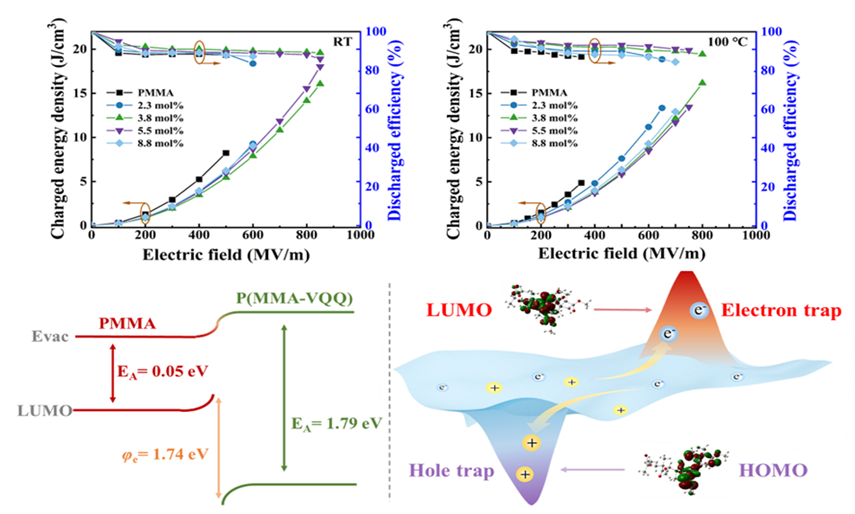 电介质薄膜电容器由于具有充放电速度快,功率密度高等优点得到了广泛应用。但是极化强度和击穿场强之间的矛盾导致了电介质材料较低的储能密度,并且严重限制了电子器件向集成化和微型化的发展。因此,如何平衡极化和击穿场强之间的矛盾,对于获得优异的储能性能具有重要意义。张志成教授团队提出了一种不依赖高极性基团来提高聚合物电介质储能密度的方法,该工作以PMMA为例,通过在极性聚合物中引入大体积缺电子的乙烯基喹啉(VQQ)单元,其可以同时抑制极化弛豫和电荷传导引起的能量损失。这项工作为平衡极性聚合物高介电常数和高击穿强度之间的矛盾,并同时实现高放电能量密度和高放电效率的全有机聚合物电介质的制备提供了新策略。该项研究成果以《缺电子喹啉基团助力极性聚合物电介质的高脉冲放电储能性能》 (Depressing Relaxation and Conduction Loss of Polar Polymer Materials by Inserting Bulky Charge Traps for Superior Energy Storage Performance in High-pulse Energy Storage Capacitors Application)为题发表在期刊《材料视野》(Materials Horizons)上(Mater. Horiz. 2023, DOI: 10.1039/d3mh00262d)。