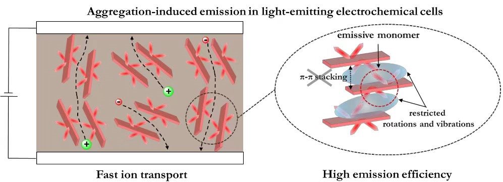 党东锋教授联合瑞典于默奥大学物理系LudvigEdman教授,查尔姆斯理工大学Ergang Wang教授等在基于聚集诱导发光分子的发光电化学电池方面取得了新进展。研究表明,在LEC工作时,AIE材料及其薄膜形貌更有利于离子传输,并且能够很好地抑制激子的非辐射失活,进而取得优异的器件性能。相比于ACQ-LEC,AIE-LEC表现出了更快的开启速度,高效且稳定的发光性能。该研究证明了AIE-LEC可能是实现快速、高效发光器件的有效途径,并提供了一种低成本和可持续发展的器件制备方法。相关研究成果以《基于分子设计的聚集诱导发光:一种制备高性能电化学电池器件的新策略》(Aggregation-Induced Emission by Molecular Design: A Route to High-Performance Light-Emitting Electrochemical Cells)为题发表在德国《应用化学》(Angewandte Chemie International Edition)上(Angew. Chem. Int. Ed. 2023, 62, e202302874)。
