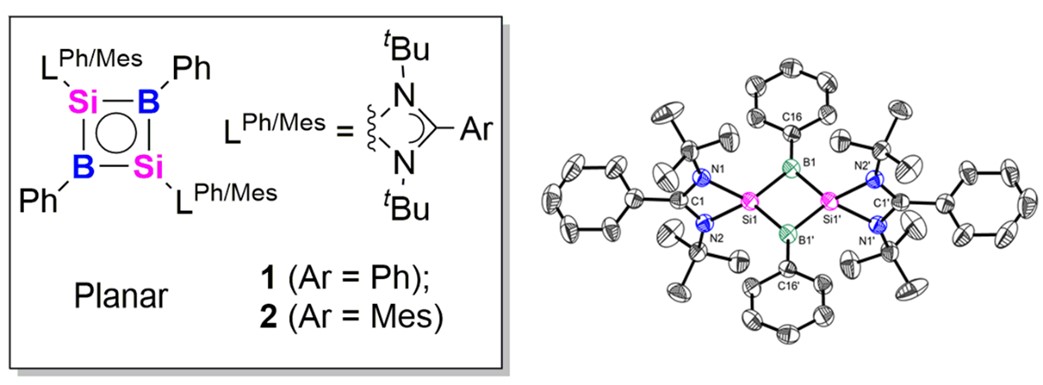 苏博超课题组一直致力于新型低价态主族元素掺杂芳香体系的合成及应用研究。近期,该团队成功合成出了一类具有2π芳香性的硅硼四元环体系,并对其光物理性质及氧化还原反应进行了详细探索。