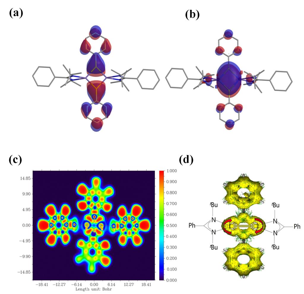 (a, b) 化合物1的LUMO与HOMO轨道电子云分布图;(c) 电子定域化函数(ELF);(d) 感应电流密度各向异性分布(ACID)