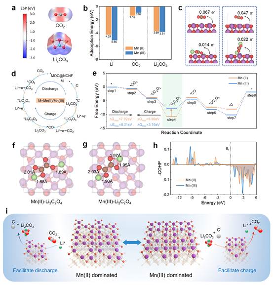 研究人员结合DFT理论模拟发现,CO2和Li2CO3分别在Mn(II)和Mn(III)位点上表现出优先吸附,并且它们在两个活性位点的电荷转移明显不同,CO2在Mn(II)上具有更高的电荷转移,而Li2CO3在Mn(III)位点上表现出了更大的电荷转移趋势。此外,由于电子结构和配位环境的不同,Mn(II)能更有效的降低CORR过程中的反应势垒,而Mn(III)位点则在激活充电过程关键中间体*Li2C2O4的Li-O键方面表现出更有利的电子结构。因此,研究人员认为Mn(II)和Mn(III)分别为CORR和COER的潜在活性位点,这一发现为开发适用于Li-CO2电池的高性能多价Mn集成混合催化剂提供了新的视角。