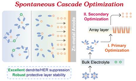 丁书江教授课题组首次提出自发级联优化策略。通过自由基聚合在锌负极上构建了可自发分离-重构的保护层(PAPE@Zn)。PAPE层内含有水溶性差的聚丙烯酰吗啉(PACMO)和溶解性好的聚氧化乙烯(PEO)。在电解液的诱导下,PEO可自发分离到本体电解液中与H2O相互作用,从而对锌离子的溶剂化结构实现初步调控,并且降低了PACMO层的脱溶剂化压力,从而提高了其稳定性,实现了初级优化。与此同时,溶解性差的PACMO在锌负极上重构为疏水的花状阵列结构,该阵列具有丰富的亲锌位点,可进一步促进Zn2+脱溶并有效的均匀锌离子通量,从而完成二级优化。使用 PAPE@Zn 的对称电池在1 mA cm-2下实现了4000小时的稳定循环。基于V2O5的全电池可在15 A g-1的高电流密度下实现大于12000次的超长循环。在0.6的超低N/P比和高负载量(约17 mg cm-2)下可稳定循环1000次,累积容量达2.32 Ah cm-2。级联优化策略将负极保护拆分为两个目标,通过逐步优化实现了锌离子电池性能的全面提升,为锌负极保护层的结构设计提供了新的见解,同时也有望应用于其他金属电池的研究。