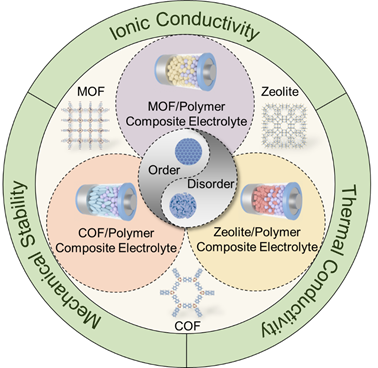 郗凯教授和冯国栋教授等人分析总结了具有有序微孔结构的无机功能材料(OMMs)微纳结构有序度对复合固态电解质性能的影响规律并阐明其内在机制。通过从离子传导特性、热传导性能和机械稳定性三个角度对OMMs类材料进行分析,研究团队致力于寻找适用于复合固态电解质的性能优化策略,并提出了不同OMMs所面临的挑战及潜在解决方案。这些研究分析不仅为获取高性能复合固态电解质提供了可靠的设计方案,还为OMMs在未来先进技术节点上的应用提供了可能性。此工作以“聚合物电解质中的微孔材料:论有序性的优势”(Microporous Materials in Polymer Electrolytes: The Merit of Order)为题发表在《先进材料》(Advanced Materials)上。徐明副教授和硕士研究生李丹阳是本文的共同第一作者。