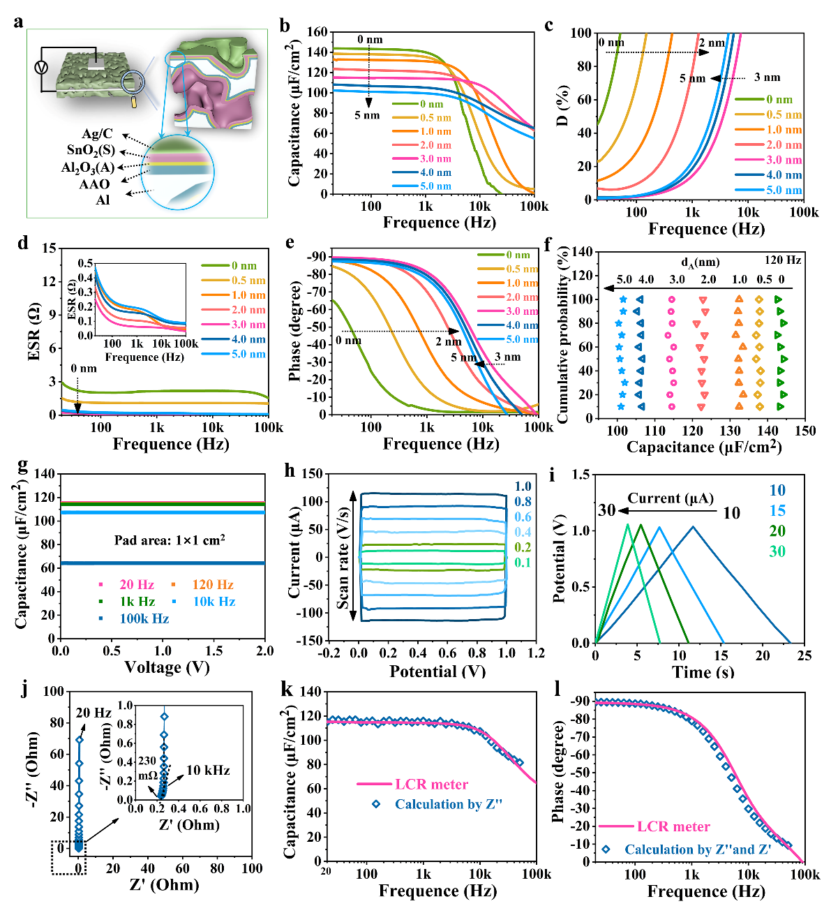杜显锋教授团队采用原子层沉积(ALD)技术制备了高导电性(1700 S/cm²)且耐高温性的SnO2材料,并且创新性地应用于替代传统铝电解电容器的阴极材料,成功地将电容器的工作温度范围大幅拓宽至-60℃~330℃。同时,得益于ALD技术的沉积精度与优势,所构建的SnO2/Al2O3/Al结构界面展现出了极高的致密堆叠特性。这一特性赋予了未封装电容器卓越的防水能力,即将其完全浸没于水中持续90天,电容器依然能够保持其性能的稳定性与可靠性。此外,通过ALD技术在电极与电介质(SnO2/AAO)界面处构建了一层3 nm的非晶态Al2O3缓冲层,形成了具有稳定范德华力键的SnO2/Al2O3/AAO界面结构。此Al2O3缓冲层不仅有效阻挡了SnO2与AAO界面间的原子扩散,还修复了AAO电介质存在的微小裂纹。该电容器在120 Hz下的容量密度可达114.5 μF/cm²,而损耗仅为2%,相位角可达-89.5°。此外,其击穿场强可达5.5 MV/cm,在1 V下的漏电流仅为7.2×10-7 A/cm²。在电路应用中,该电容器能够滤除120 Hz至100 kHz的信号,电压纹波可仅为15 mV,同时展现出了优异的充放电性能。