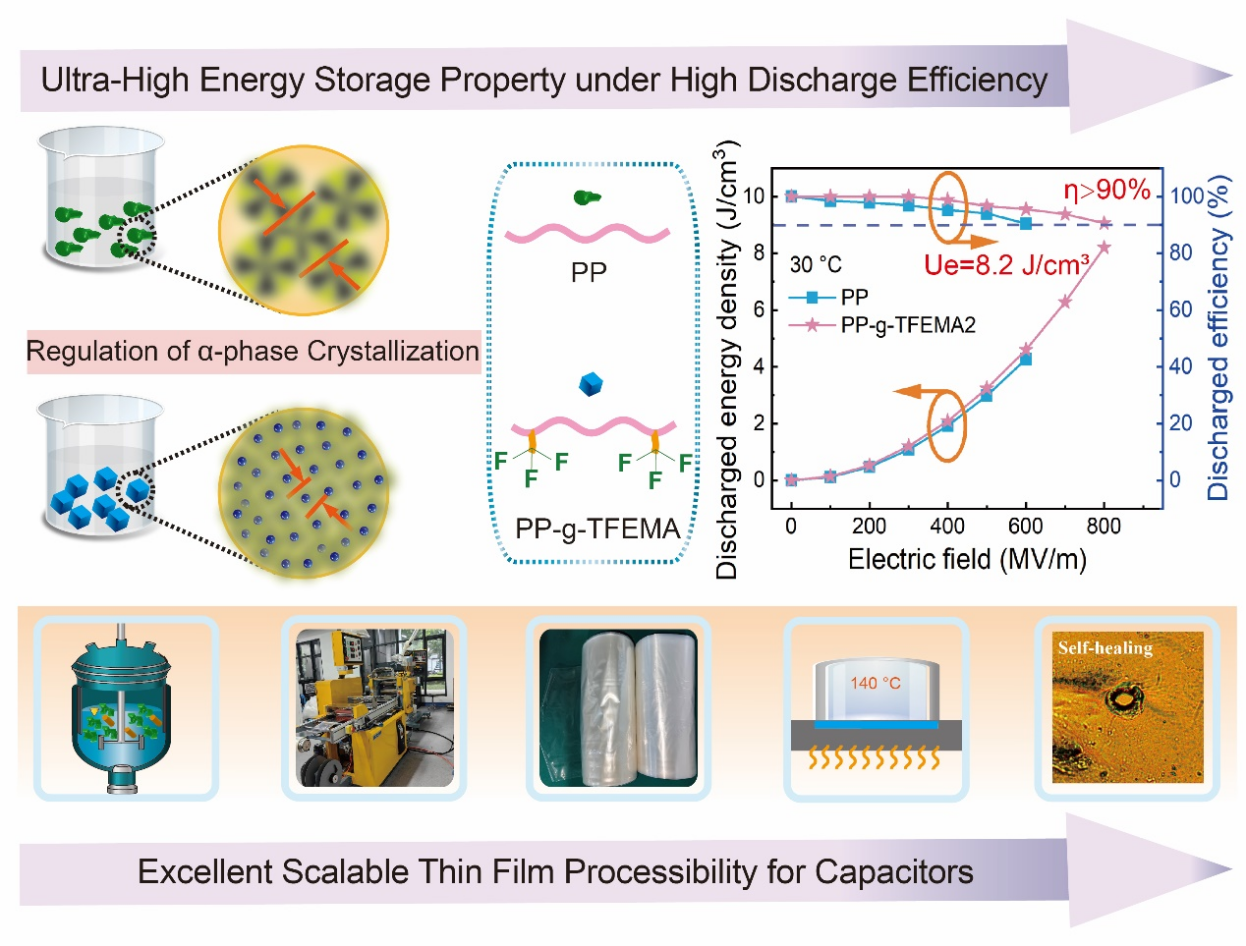 张志成教授团队设计了一种在聚丙烯(PP)上接枝含氟基团的甲基丙烯酸三氟乙酯(TFEMA)的接枝聚合物材料PP-g-TFEMA,并将得到的公斤级样品熔融挤出流延制备了10 μm厚度薄膜。研究发现,含氟基团的效应能兼具极性和促进结晶特性以协同提升聚合物储能与加工性能,其中优化后的PP-g-TFEMA能在相当高的电场(800 MV/m)下工作,可释放能量密度高达为8.2 J/cm3,能量转换效率超过90%。TFEMA的引入还能够显著提高金属电极在薄膜表面的附着力、减小薄膜在击穿时形成的孔洞大小及电极损失面积,这些均对薄膜电容器的长期可靠性运行起到积极作用。