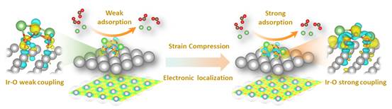 丁书江教授&杨国锐副教授团队提出了电子局域化加速CO2RR,进而强化Ir-O耦合,诱导低结晶度Li2CO3产物从而优化CO2ER进程的晶格压缩策略,该策略使得Li-CO2电池实现了超低过电位(0.33 V)以及超高能量效率(~88.7%),并且在电池运行超过>1100小时后仍能维持3.3 V的稳定充电电位,这是迄今报道的最佳性能。通过使用一系列原位/非原位表征以及理论计算,团队揭示了晶格压缩导致配位环境变化,从而增强电子局域化效应,加速催化剂表面附近的Li+迁移,使其快速参与CO2RR过程,进而受到强化的Ir-O耦合作用调变Li2CO3分子的对称性,降低其低结晶度,最终促进其高效分解。