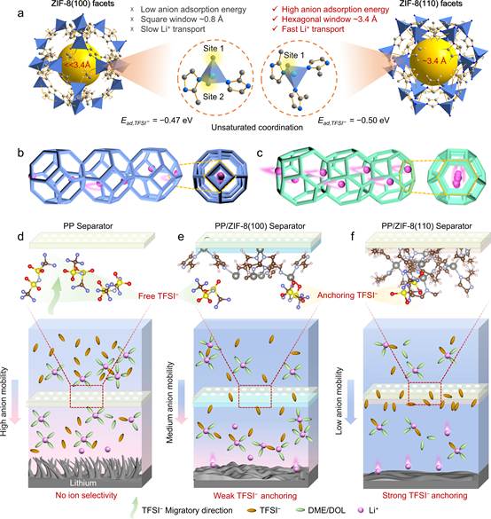 郗凯教授团队聚焦于锂金属电池的界面调控与离子传输优化,致力于开发高性能隔膜材料以提升电池的快充能力和循环稳定性。研究团队选择暴露(110)晶面的ZIF-8作为电荷选择性离子筛分中心,利用其表面不饱和的锌位点作为路易斯酸位点,选择性锚定TFSI⁻阴离子。同时,ZIF-8的微孔结构提供了空间限制,降低了局部电流密度,增强了界面稳定性。实验结果表明,采用该隔膜的锂金属电池在2 mA cm⁻⟡和1 mAh cm⁻⟡条件下实现了超过1400次的稳定循环,平均库仑效率高达98.7%。此外,在高负载条件下,锂铁磷酸盐(LiFePO₄)电池在5 C倍率下循环3000次后仍保持99.9%的库仑效率,展现了优异的快充性能。