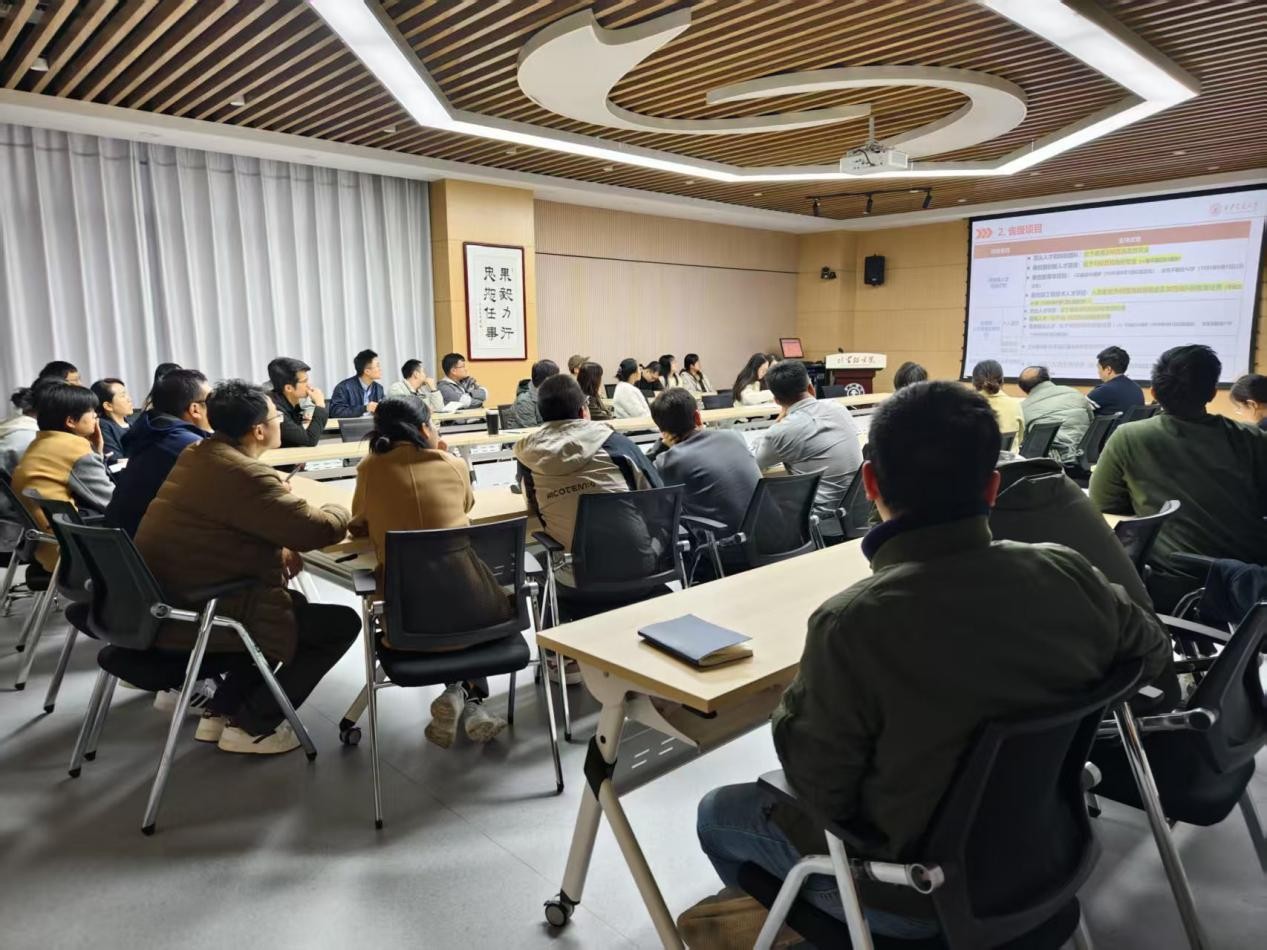 贺苗、常雯老师就各类人才计划、博士后引进与支持政策、博士后流动站相关业务等进行介绍,梳理项目类型与申报路径。董达老师介绍了近期学院高级职称晋升经验总结和“校招共用”项目情况。他结合学校评审要求与以往申报经验,总结实用策略,为拟晋升教师提供清晰指引。各位老师对申报过程中遇到的实际困惑进行现场答疑。