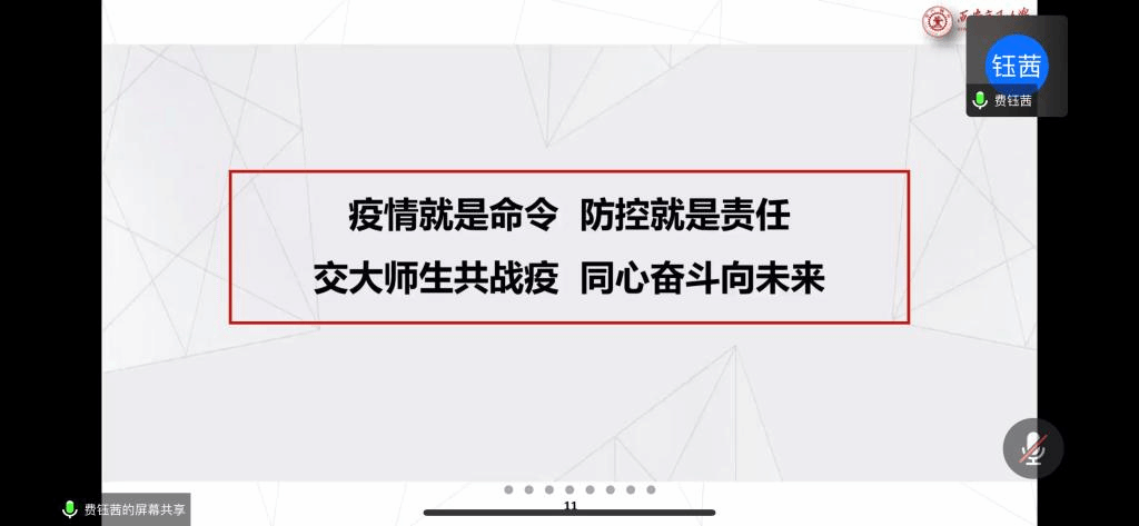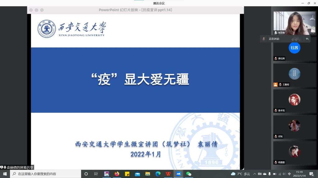 本次会议邀请脱裤吧 学生微宣讲团(筑梦社)社长,马克思主义学院袁丽倩进行“携手共抗疫,交大勇担当”主题宣讲。袁丽倩带领支部成员回忆了疫情出现以来志愿者们的辛劳和社会各界的倾力帮助。她借《抗击新冠肺炎疫情的中国行动》白皮书和《共产党宣言》强调了人民至上的重要性。通过袁丽倩精彩生动的讲述,支部成员们深刻体会到伟大的抗疫精神,以及身为交大学子所肩负的使命与担当。