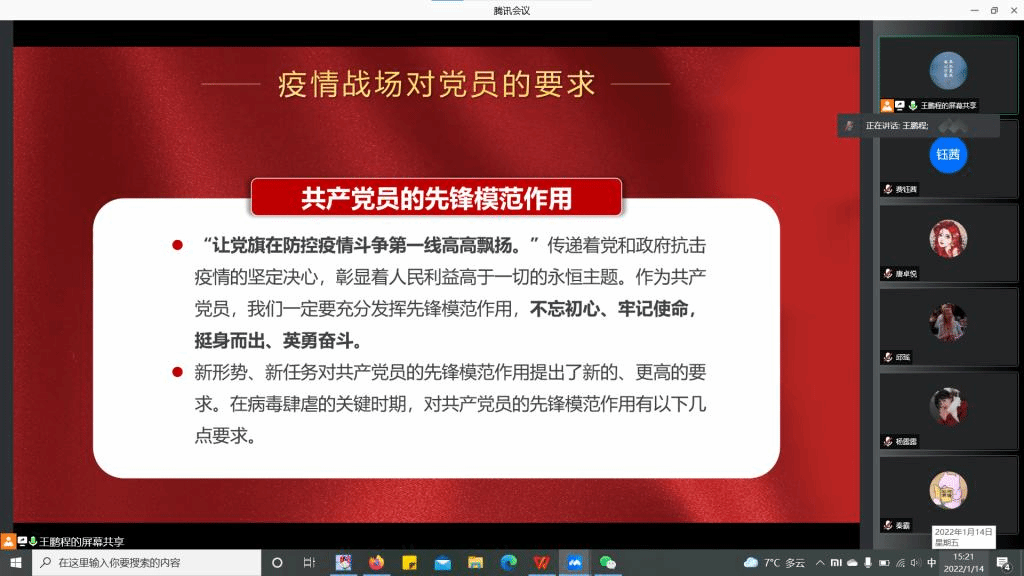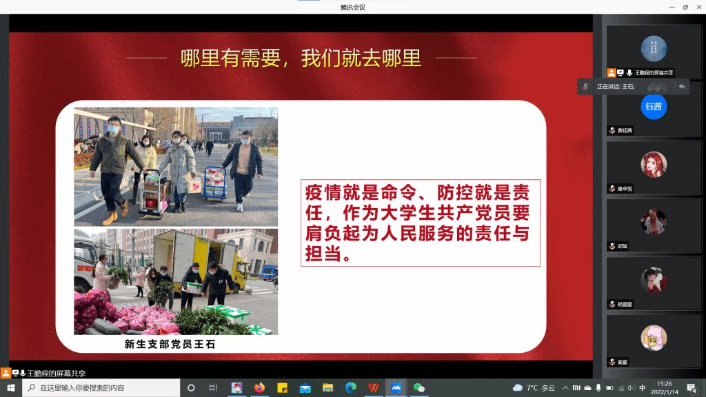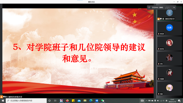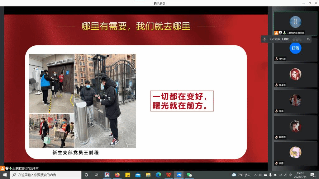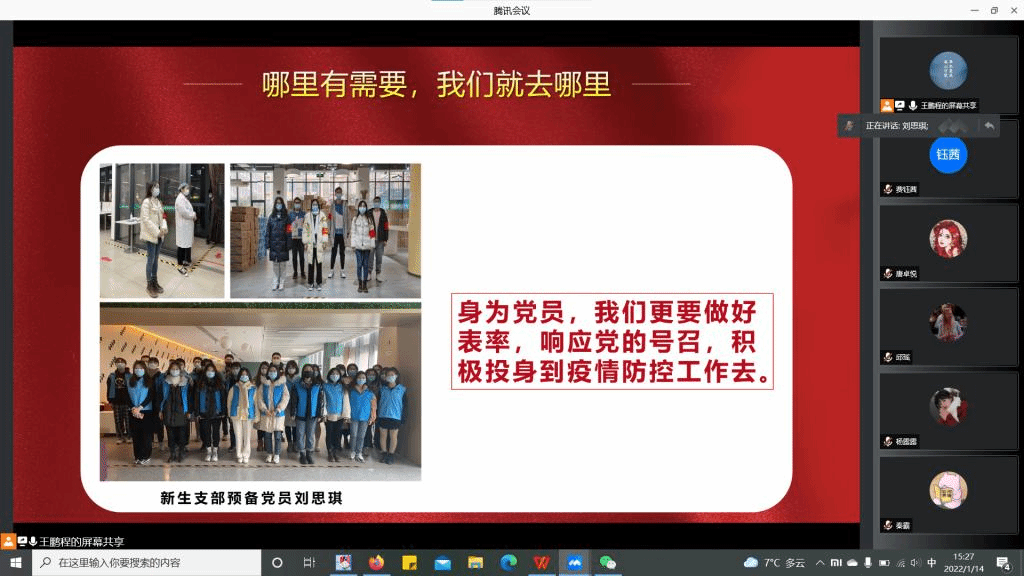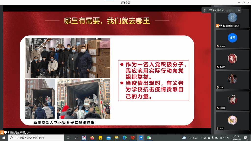 为更好把握伟大抗疫精神,凝聚磅礴奋进力量,争做西迁精神新传人,2022114日下午,脱裤吧 新生党支部在线上召开2022年第一次党员大会。会议由支部书记王鹏程主持,支部全体党员以及入党积极分子参加,脱裤吧 辅导员唐卓悦列席会议。