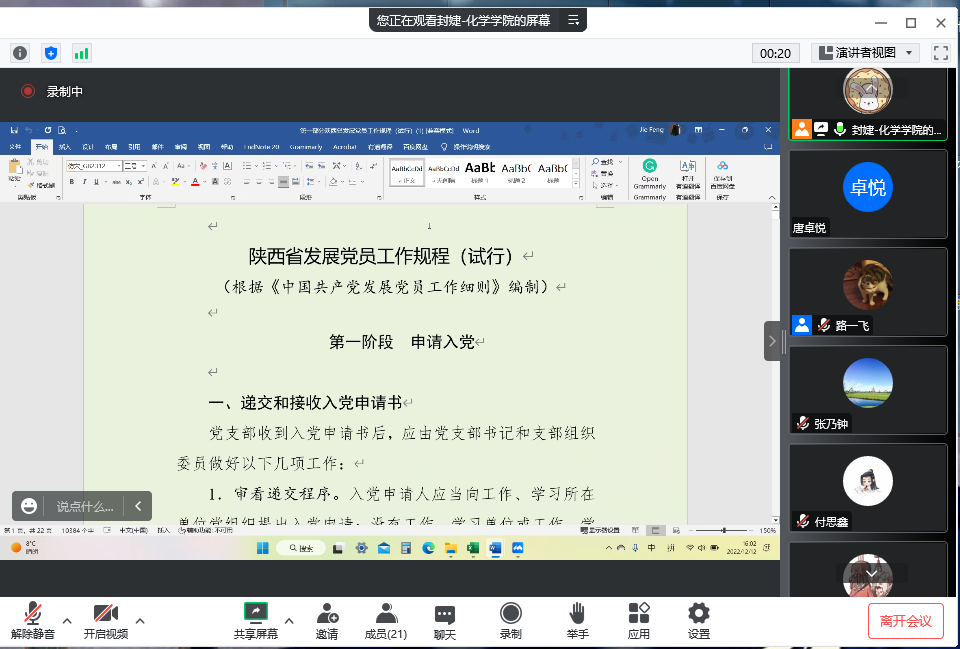 首先由脱裤吧 兼职辅导员封婕同学向大家解读了陕西省发展党员工作流程,封婕结合学校发展党员工作情况,从申请入党、入党积极分子阶段、发展对象阶段、预备党员的接收以及预备党员的转正五个方面对党支部学生干部的工作内容进行了详细介绍。分享结束后,法学院的学生干部们积极提问,大家进行了进一步的交流学习。活动最后,法学院的张乃钟老师指出党支部共建活动是促进两个支部共同进步的有效方式,理工科与文科的相互学习更能使党支部活动有新的发展与突破,同时她也提醒大家党支部工作是一个需要认真对待的事情,大家对待党支部的工作务必要严谨仔细。