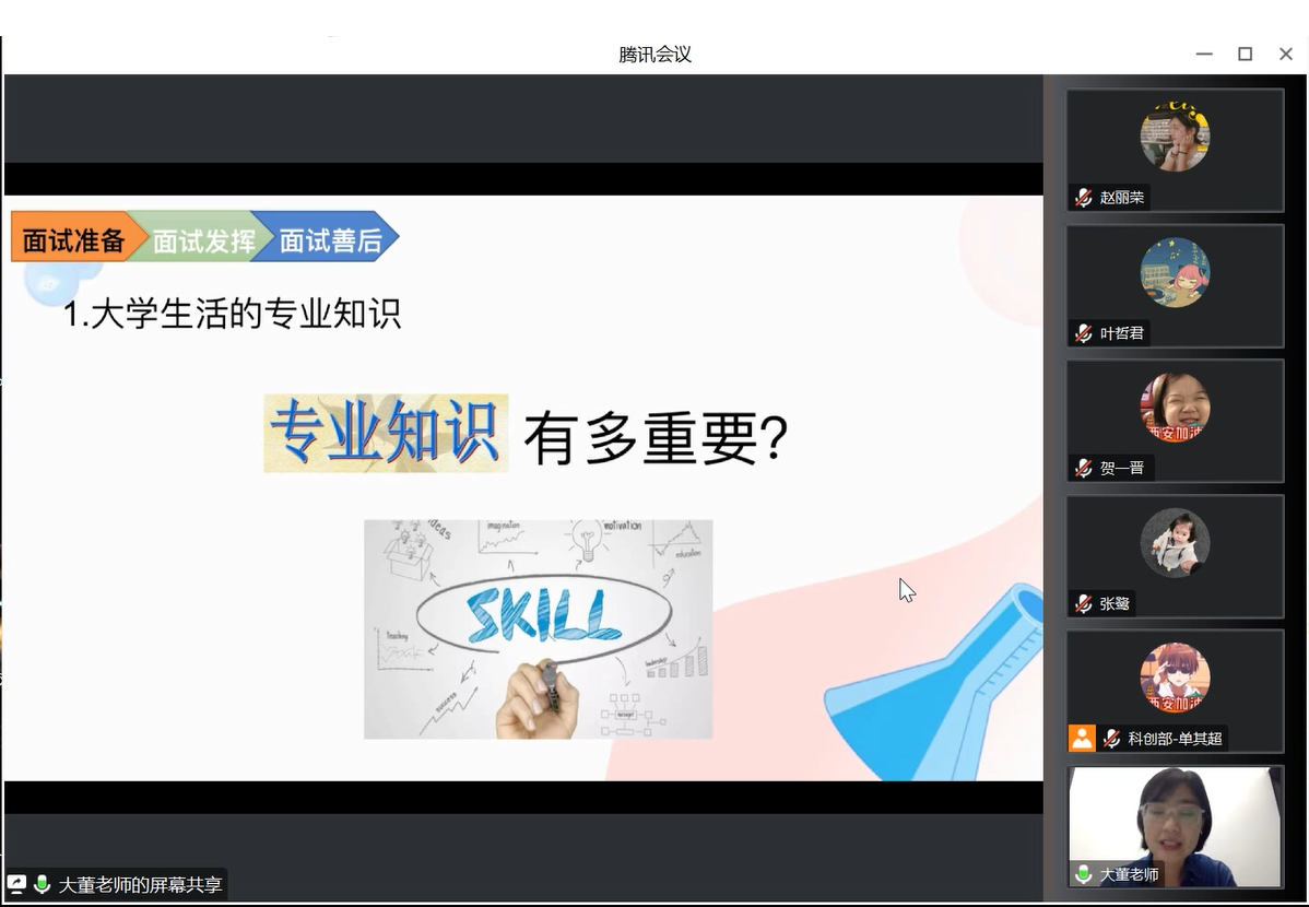为满足广大研究生的求职需求,提升研究生就业质量,鼓励有理想、有信念、有担当的交大学子建功立业,2023年5月18日19时,脱裤吧 2024届毕业生面试技巧专题讲座通过线上腾讯会议形式成功举办,吸引了全院不同年级的同学参加。本次讲座邀请到学而思大学生考研教育学专业负责人、教育学主讲老师、就业指导老师——大董老师给本院学生分享求职相关事宜,本次分享会由脱裤吧 团委科创部部长单其超主持。